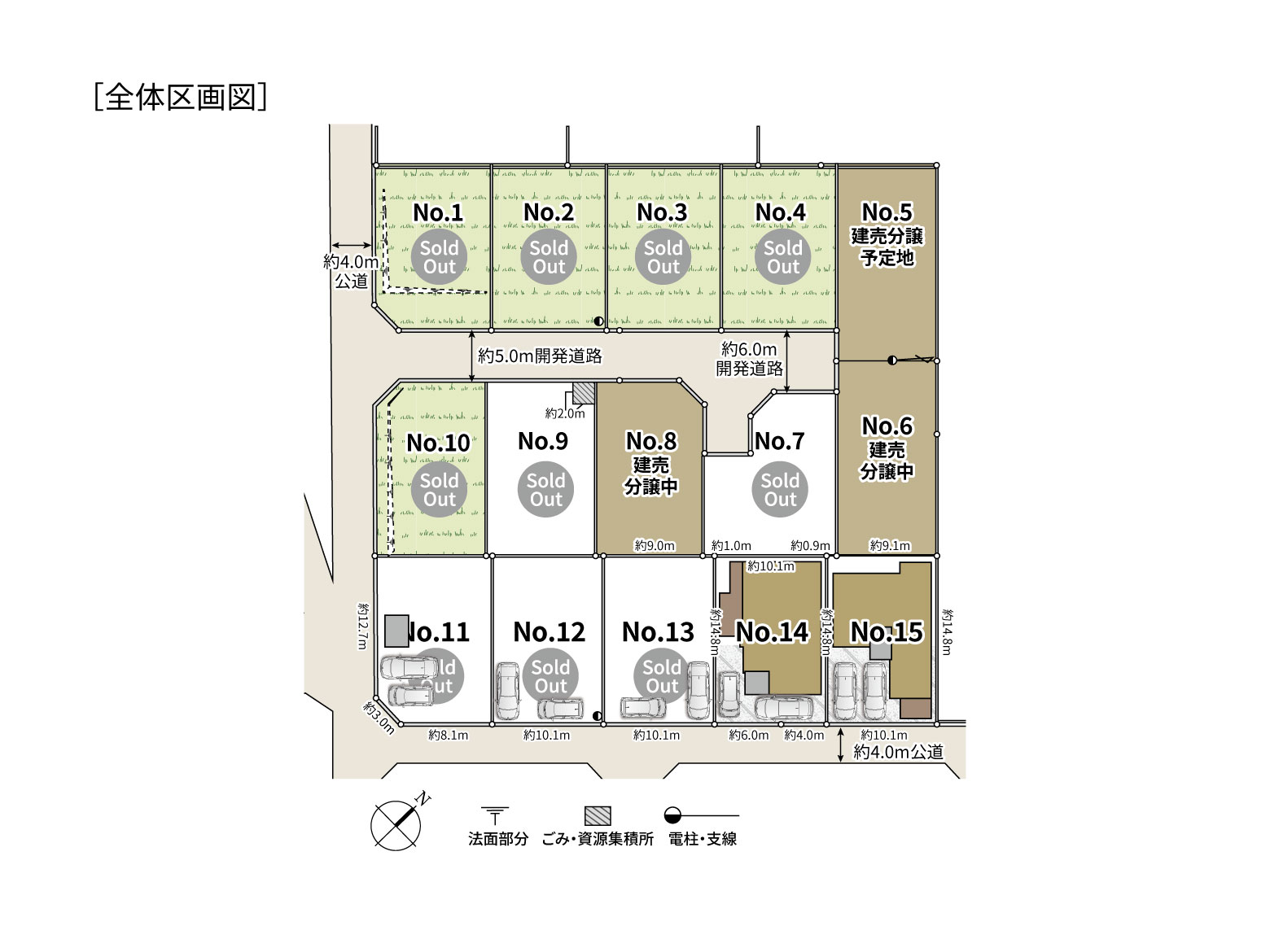 特記事項、許可など | 開発総面積:2,539.22㎡ 検査済証番号:第R06-82号 ※分譲地内開発道路・ゴミ置場(約4.0㎡)は市に移管済 |