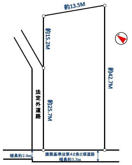 | 接道状況 | 西側建築基準法第42条2項道路(公道)幅員役3.3mに約12.0m接道、北側法定外道路(公道)幅員約3.3mに25.7m接道 |