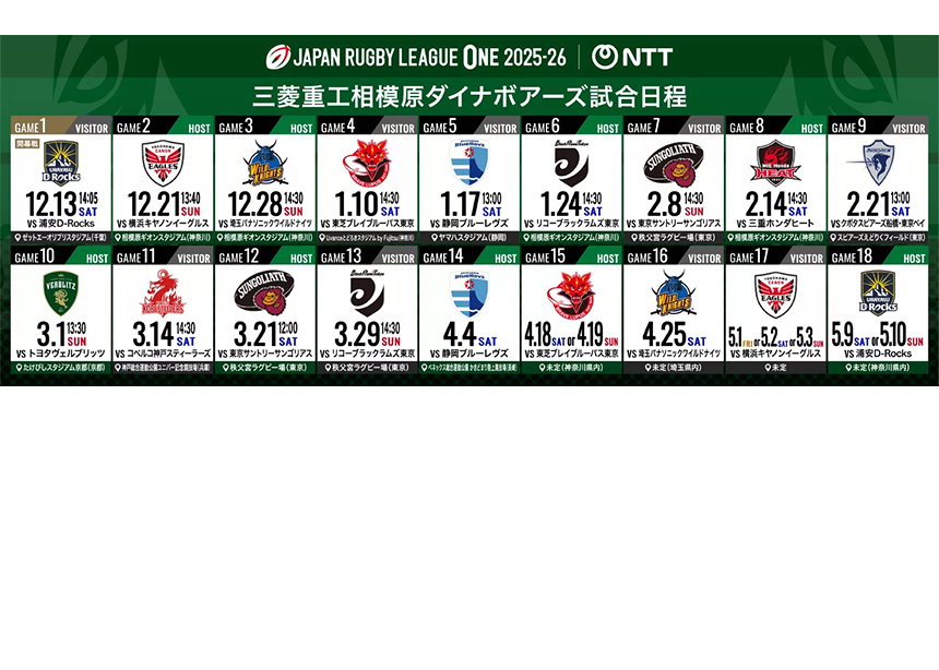 三菱重工相模原ダイナボアーズ(以下ダイナボアーズ)は、1971年の創部から一貫して神奈川県相模原市を中心に活動している、地域に根付いたラグビーチーム。日本代表チームの活躍もあり、近年人気を急激に高めているラグビーは、2022年には新たな国内リーグ「リーグワン」が開幕。その最高峰グループであるディビジョン1(12チーム)に位置するのがダイナボアーズです。今回は、2025年12月21日(日)に相模原ギオンスタジアムで行われた新シーズンのホスト開幕戦をレポート。初のラグビー観戦となる筆者が“全緑”応援した試合の様子だけでなく、グルメやその他イベントまで、たっぷりと楽しんだ1日をお伝えします!