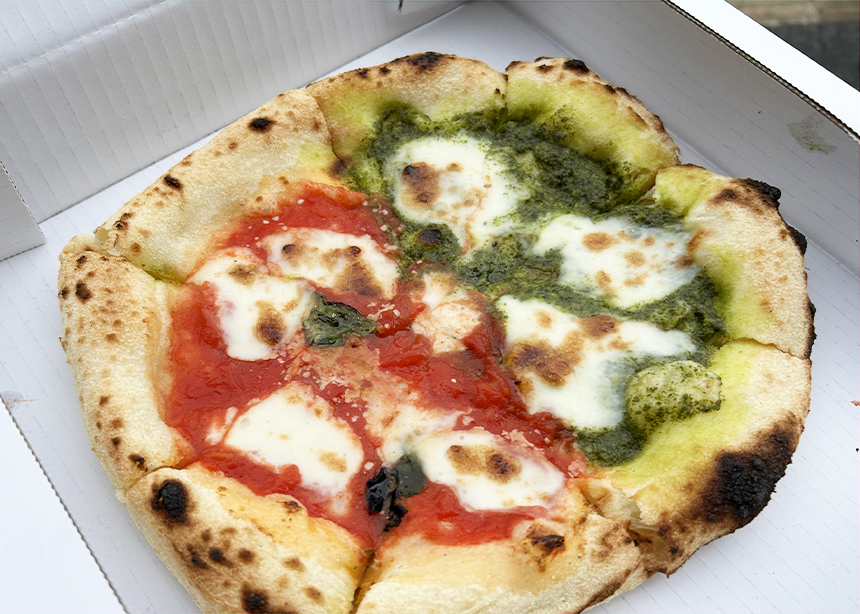 マルゲリータとジェノベーゼのハーフ&ハーフ。ラーメン、ハンバーガー、丼ものなど気になるメニューが勢揃いのなかで、メインに選んだのはkitchen Otoさんのピザ。