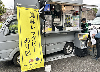 試合の日は、いつもたくさんのキッチンカーが出店するそうで、この日も30以上の店舗がスタジアムをぐるっと囲うように並んでいました。