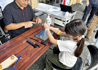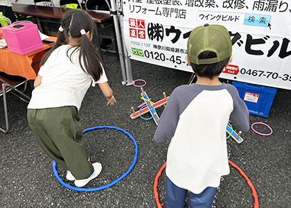 塗装業を営む(株)ウイングビルドさんではわなげを楽しみ、景品のお菓子をゲット。