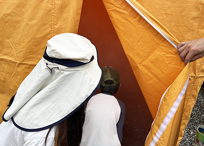 こちらでは消火器を使った消火体験と、煙が充満したテントの中で火事現場の疑似体験をしました。