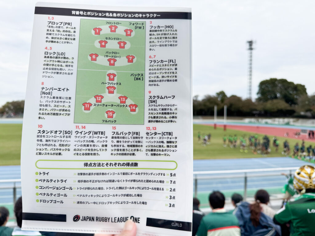 裏面には各ポジション名や役割などが記載されていて、ラグビー観戦初心者の私にはとてもありがたい♪
