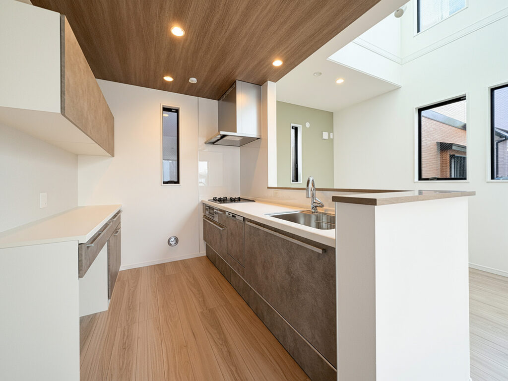 木目調の天井と落ち着いたカラーのキッチンが調和し、