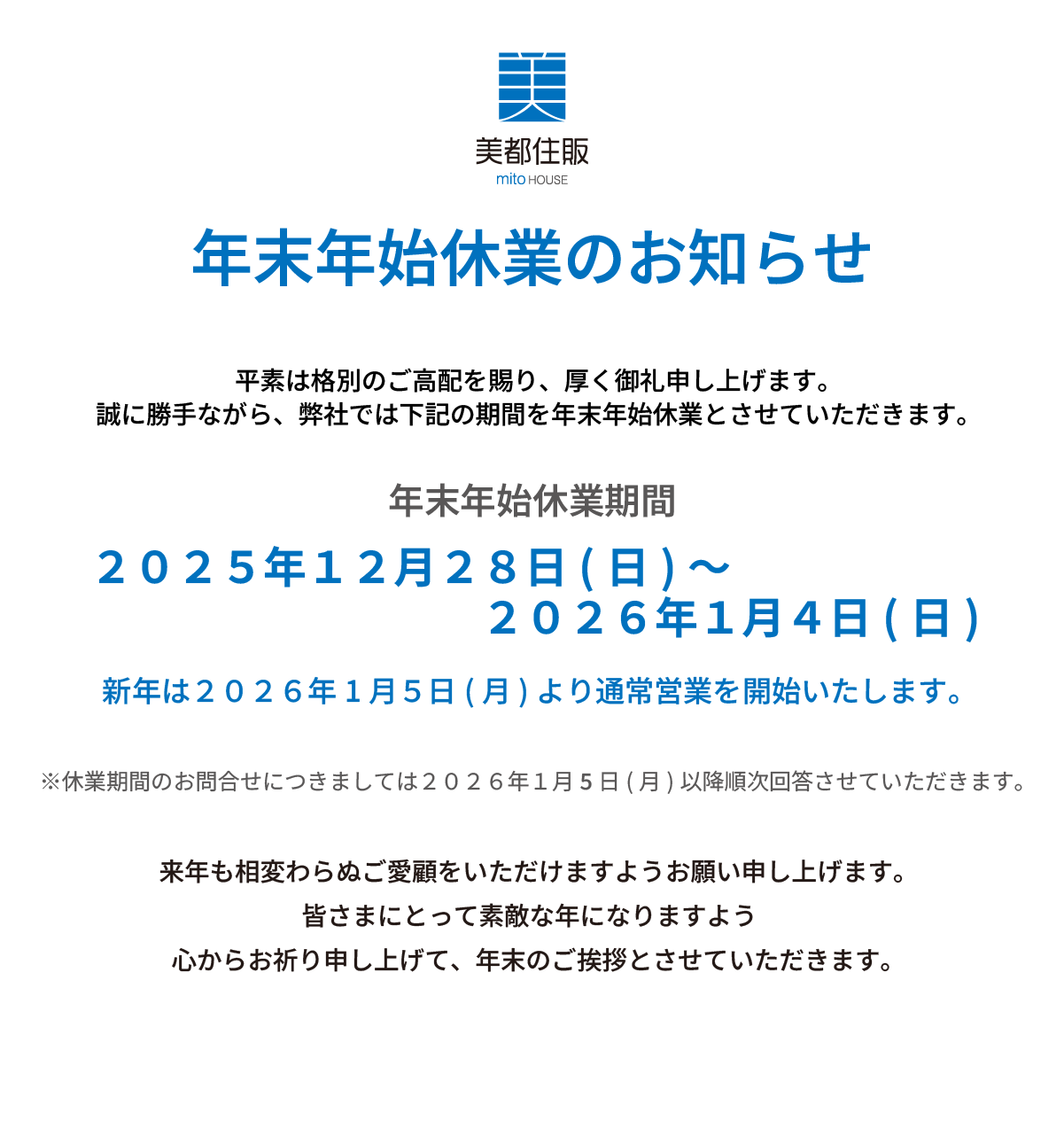 NEWS・BLOGニュース・ブログ ニュース ニュース一覧 お知らせ キャンペーン 販売開始 イベント ブログ ブログ一覧 お知らせ 販売開始 キャンペーン・イベント情報 現場レポート 住まいのこと 地域情報 その他 ニュース お知らせ 2025.12.102025-2026年 | 年末年始休業のお知らせ 前へ 一覧ページへ戻る 次へ