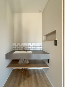 洗面化粧台のタイルも可愛らしく仕上げていただき、空間のアクセントになっています。
