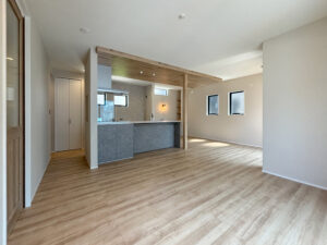 やさしい木の風合いが感じられる内装に、落ち着いたグレーのキッチンを合わせることで、ナチュラルすぎず少し大人っぽい雰囲気に仕上げていただきました!