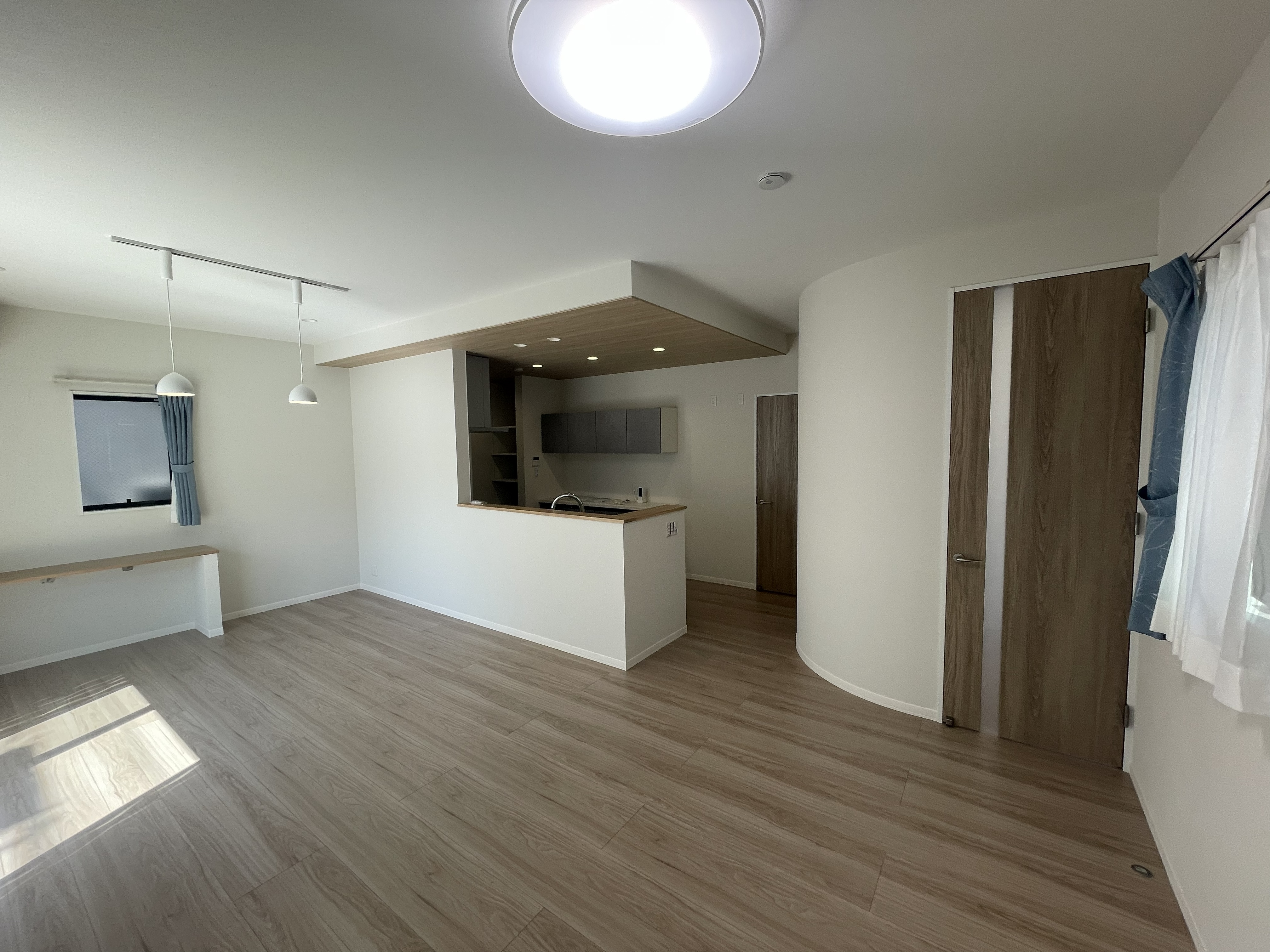 壁をやわらかく湾曲させることで、広いリビングは、さらに広がりを感じられる空間となっています。